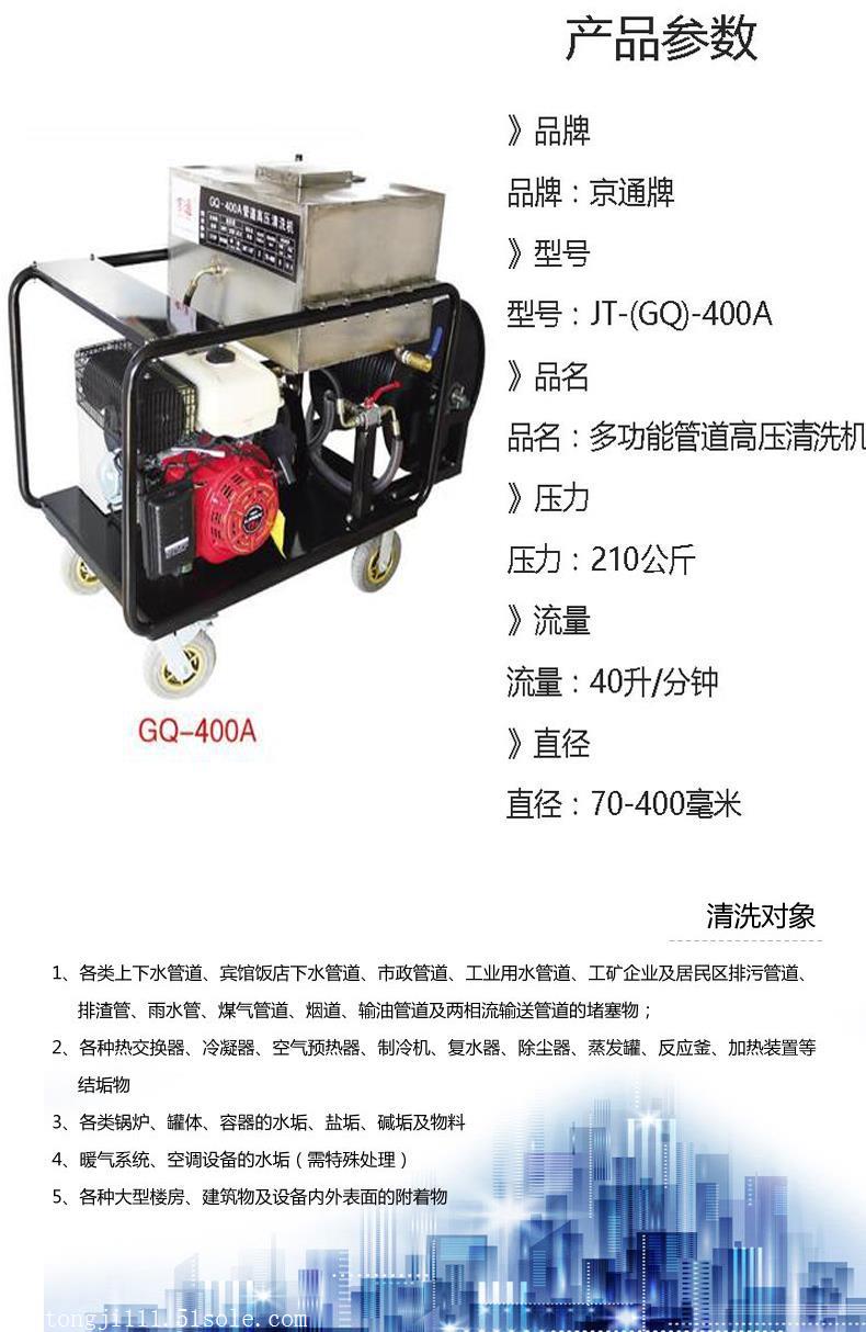 400a高压管道疏ed机由一台17马力的汽油引擎提供动力,驱动意大利import高压泵,最大压力:210千克,流量:40升/分钟,疏通能力:直径:70-400毫米,管道尺寸不超过100米。